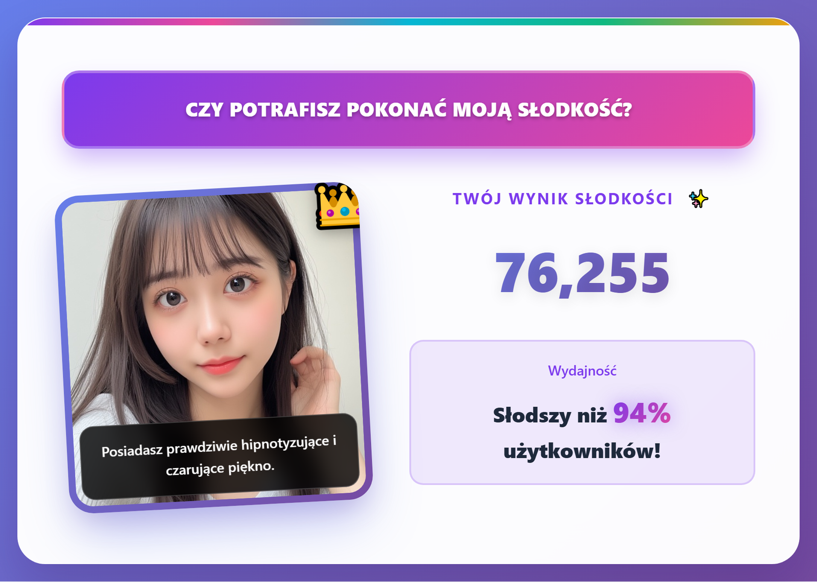 Twoja ostateczna analiza słodkości zawiera cztery kluczowe elementy: komentarz wygenerowany przez AI, Twój numeryczny wynik słodkości, ranking percentylowy (np. „Słodszy/a niż 99% użytkowników”) oraz stałą odpowiedź na pytanie „Czy jestem słodki/a czy nie?”. Jeśli dodasz niestandardowy podpis, również zostanie on uwzględniony.