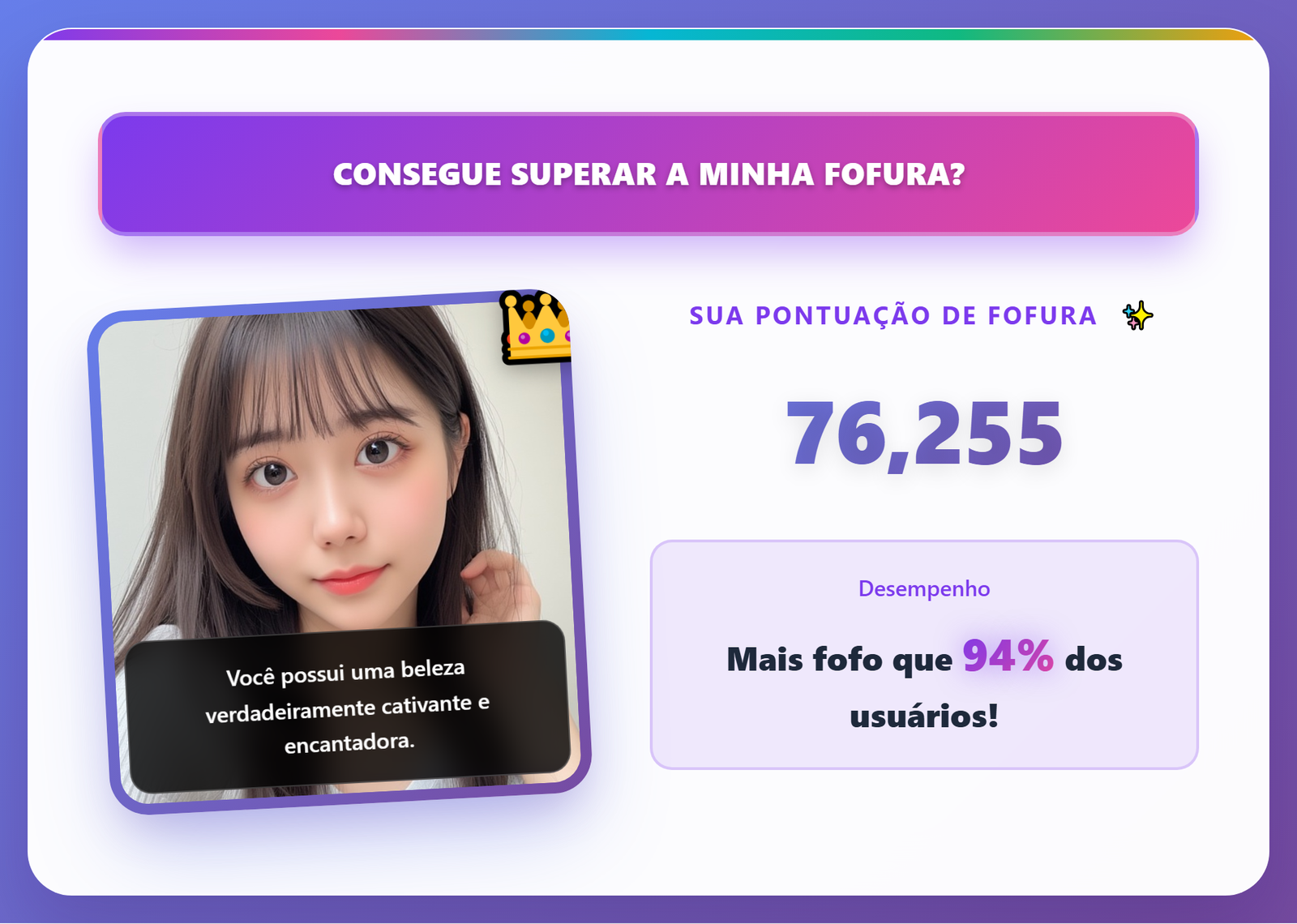 Sua análise de fofura final inclui quatro coisas principais: um comentário gerado por IA, sua pontuação de fofura numérica, um ranking percentual (por exemplo, "Mais fofo(a) que 99% dos usuários"), e uma resposta fixa para a pergunta "Eu sou fofo(a) ou não?". Se você adicionar uma legenda personalizada, ela também será incluída.