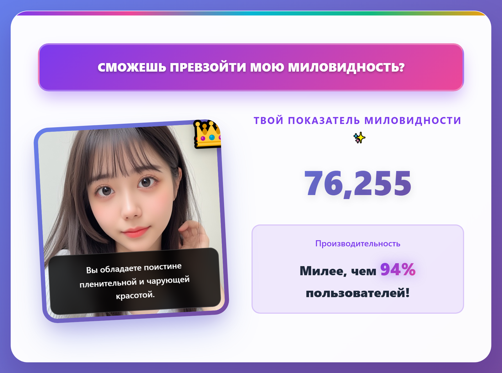 Получите свой уровень милоты и персонализированный отзыв всего за 3–10 секунд благодаря молниеносной обработке.