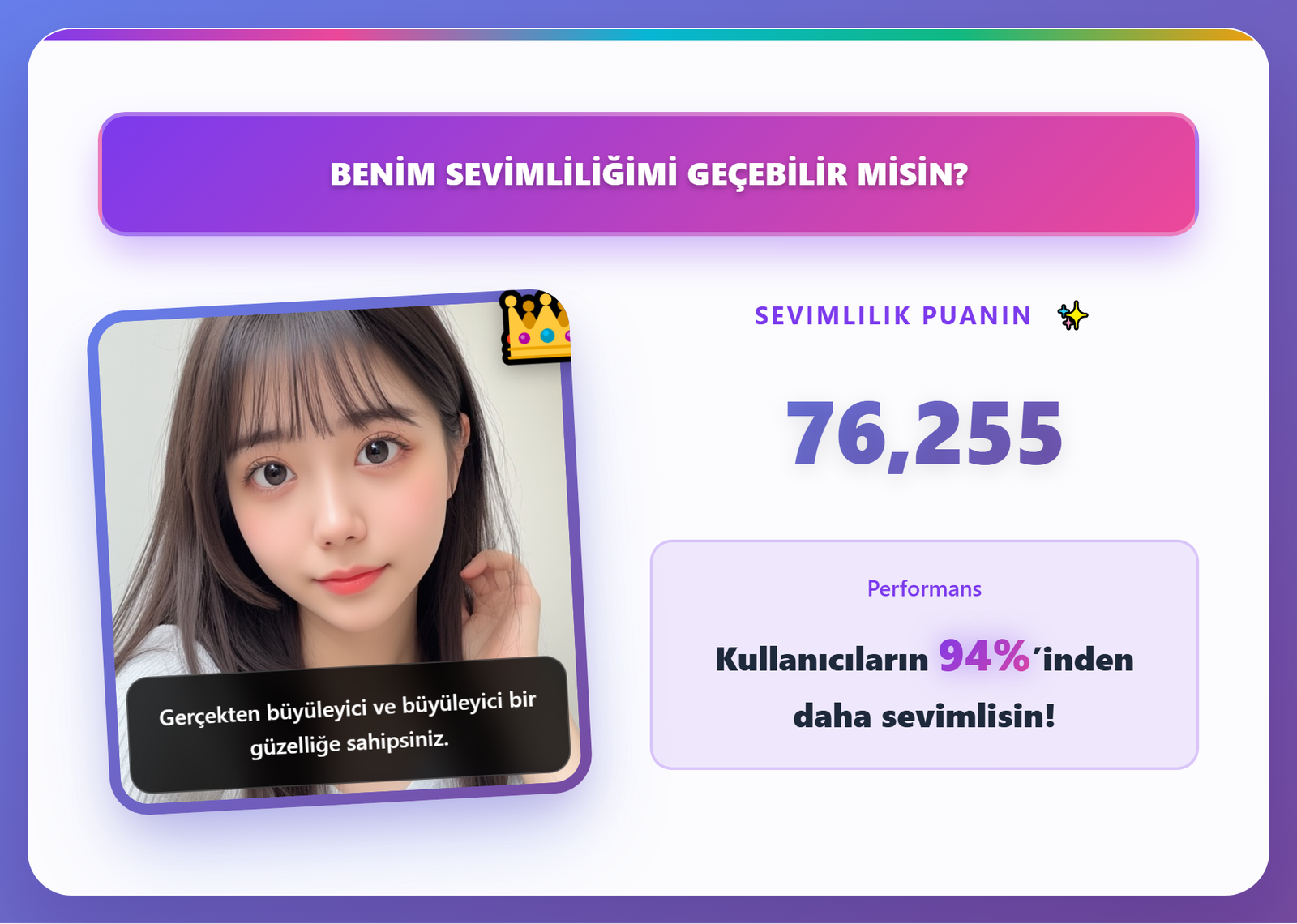 Yalnızca 3–10 saniye içinde sevimlilik puanınızı ve kişisel geri bildiriminizi yıldırım hızında alın.
